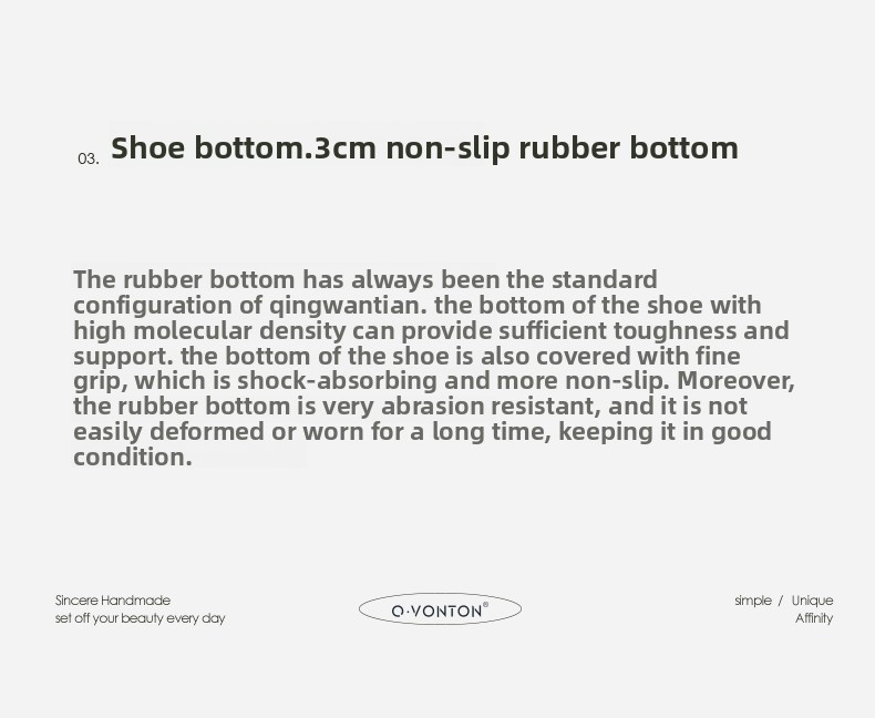 Reliable Foundation: The wear resistance of rubber soles goes without saying. Rubber has a high density, making it elastic and slip resistant.